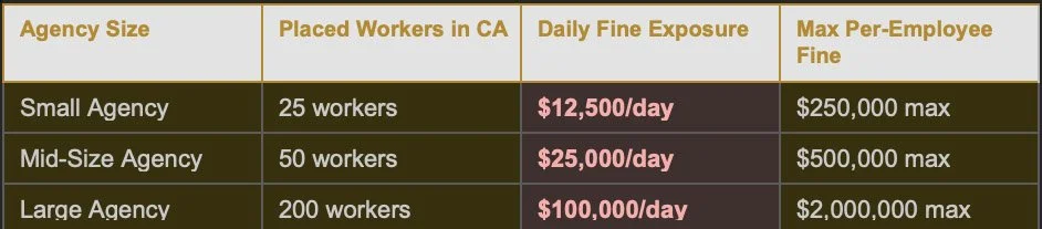 For a staffing agency with 50 placed workers in California, non-compliance carries a daily penalty exposure of $25,000. For an agency with 200 placed workers, that number is $100,000 per day. The March 30 deadline is not a soft deadline.