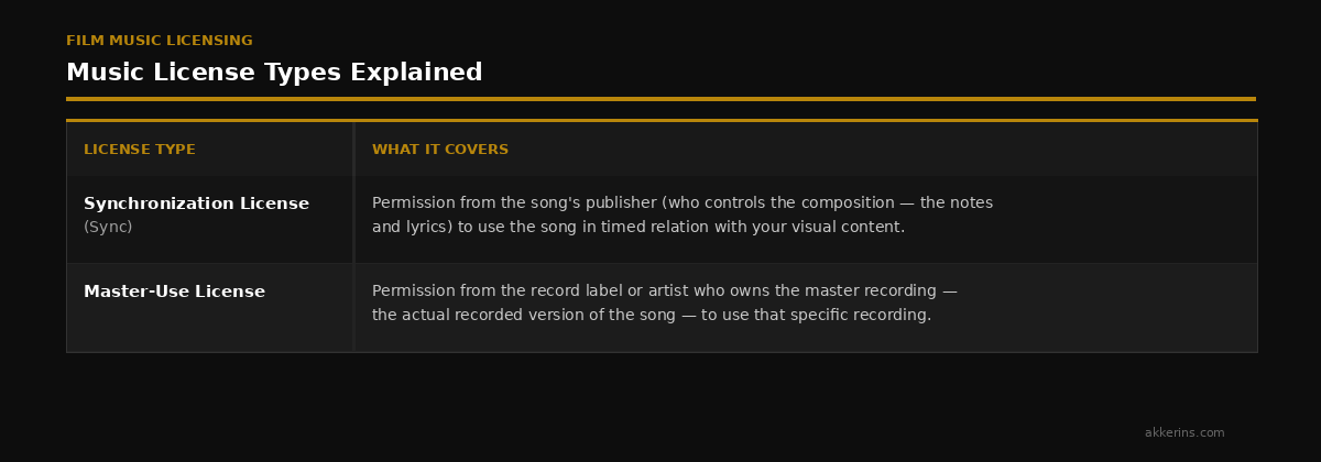 Music clearance is one of the most technically demanding and frequently mishandled elements of film production. Every piece of music in your film — including music heard in the background of a scene, music playing from a radio or TV, songs sung by characters, and end credits music — requires two separate licenses: